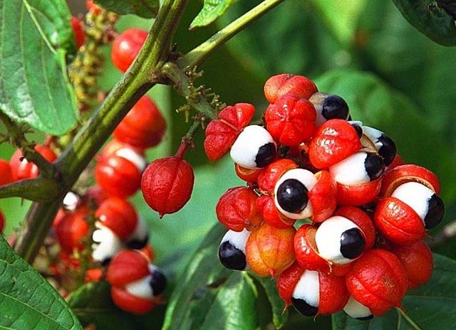 Гуарана – вечнозеленая вьющаяся лиана, распространенная преимущественно в Парагвае и Бразилии. Листья кустарника крупные, собраны в пучки. Цветы – круглые, насыщенно-красные. Но наибольшей ценностью является плод гуараны – желтый, с красной верхушкой. Созревая, он лопается, обнажая черное или коричневое семечко, в состав которого входят: