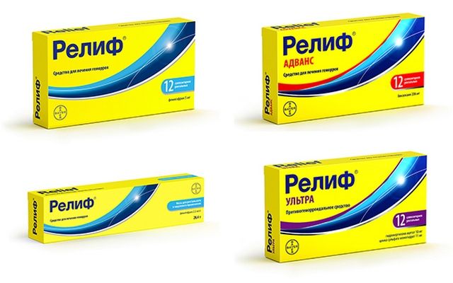 Существует целое семейство лекарственных препаратов под маркой Релиф. Включает среди прочих Релиф Адванс мазь и суппозитории, Релиф Ультра суппозитории.