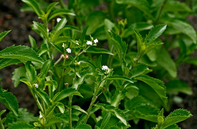 Стевия (двулетник сладкий, медовая трава) – многолетний травянистый кустарник с прямостоячими стеблями, высота которых достигает 80 см. Ежегодно старые стебли отмирают, а на их месте появляются новые, усыпанные множеством мелких темно-зеленых зубчатых листочков. Так, на одном кустике может созреть более 10 тысяч таких листочков, которые и используются в медицинских или кулинарных целях.